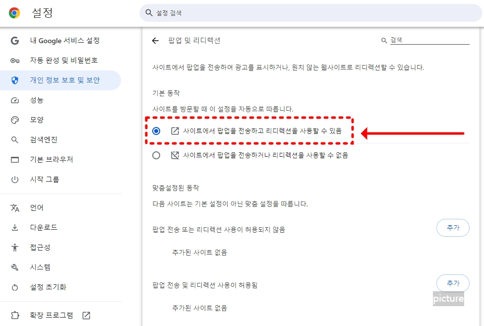 6. "기본 동작"에서 "사이트에서 팝업을 전송하고 리디렉션을 사용할 수 있음"을 눌러주세요.